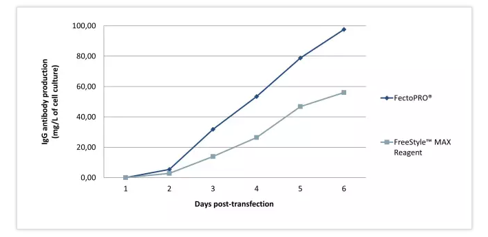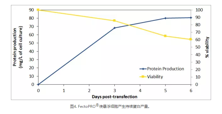 過去幾年,蛋白質生產的持續(xù)時間有所增加,大部分蛋白質生產過程持續(xù)1~2周,以獲得最佳的蛋白產量。FectoPRO?確保幾天內產生持續(xù)的蛋白產量,同時保持較高的細胞活力以延長蛋白生產。