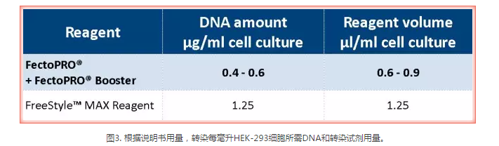 圖2. FectoPRO?大幅提高懸浮CHO和HEK-293細胞的蛋白產量。按1×106個細胞/ml的密度將FreeStyle? CHO-S和HEK-293F細胞培育在30 ml的無血清培養(yǎng)基中,并依照每種試劑說明書推薦用量FectoPRO?+FectoPRO?輔助藥劑Booster (0.4 μg DNA/ml)、FreeStyle?MAX試劑(1.25 μg DNA/ml)或PEIpro?(1 μg DNA/ml)進行轉染。用蛋白質G親和性定量法(HPLC)和Western Blot檢測轉染后72小時(CHO細胞)和120小時(HEK-293細胞)的IgG3-Fc (34 kDa)的產量。
