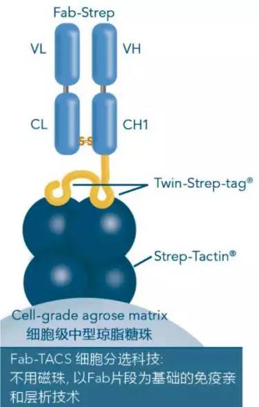 以Fab片段為基礎的無痕親和細胞分選技術(traceless affinity cell selection, Fab-TACS),由IBA Lifesciences根據(jù)其獨家的Strep-tag?/Strep-Tactin?蛋白純化系統(tǒng)發(fā)展而來。Fab-TACS運用免疫親和層析的原理,利用細胞表面抗原分子CD marker與Fab片段的特異性結(jié)合來進行捕捉及釋放目標細胞。以不具磁性且可逆的試劑,取代一般具高親和力的完整抗體, 直接由全血或其他血液樣本來進行溫和的標準化分選,因此能精準的提供您不含標記、未被活化的目標細胞。