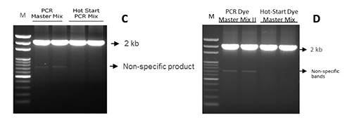 *使用Hot-Start Master Mix(含熱啟動(dòng)酶)的實(shí)驗(yàn)組PCR產(chǎn)物特異性較高