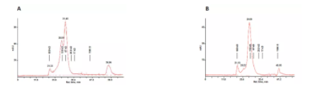 Figure: Analytical SEC of Human serum (Sample for TAC) . A) eluted IgG from Hi-BindTM T-Gel Agarose Cat. No. M1313 . B) on Superose 12 HR 10/30 column in 50 mM sodium phosphate; 0.3 M NaCl pH 7.2 at 0.4 ml/min.