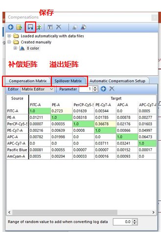 出現(xiàn)補(bǔ)償編輯欄,從PE通道中去除FITC的熒光信號(hào),使PE通道的Mean/Median值與陰性細(xì)胞群一致。