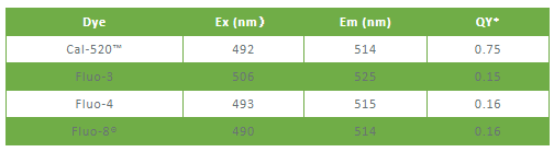 因為該系列染料有更高的量子產(chǎn)率,是Fluo-3 or Fluo-4.的3倍,什么意思呢,就是吸收同樣數(shù)目的光子,Calbryte?系列能發(fā)出的熒光強度是它們的3倍,而且激發(fā)光同樣是常見的499nm。