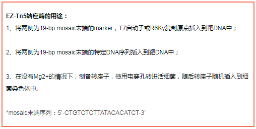 EZ-Tn5轉(zhuǎn)座子可在體外插入到含有靶DNA的載體。當(dāng)EZ-Tn5轉(zhuǎn)座子在沒(méi)有鎂離子孵育時(shí),形成穩(wěn)定的EZ-Tn5轉(zhuǎn)座體復(fù)合體,可以被電擊進(jìn)入活細(xì)胞,一旦進(jìn)入細(xì)胞中,轉(zhuǎn)座體由細(xì)胞內(nèi)鎂離子活化,就能隨機(jī)插入到宿主的基因組DNA中。