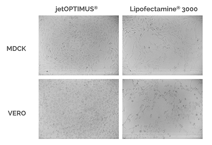 △圖2. 使用jetOPTIMUS?轉(zhuǎn)染24小時(shí)后,細(xì)胞仍然健康并保持良好形態(tài)。根據(jù)L3K和jetOPTIMUS?說(shuō)明書(shū)要求進(jìn)行轉(zhuǎn)染,24小時(shí)后在相差顯微鏡下觀察MDCK和VERO細(xì)胞的狀態(tài)。
