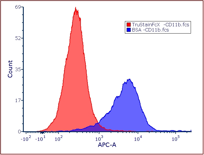 (OCI-AML3細胞系用TruStainFcX(Cat#101319)封閉(紅色TruStainFcX直方圖)以及用5%BSA封閉(藍色BSA直方圖)后,染APC-CD11b(cat#101211,cloneM1/70)結(jié)果)