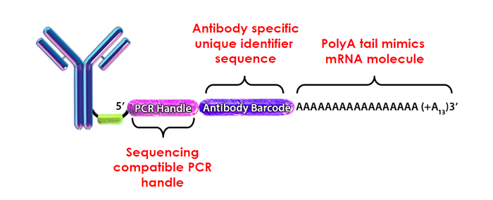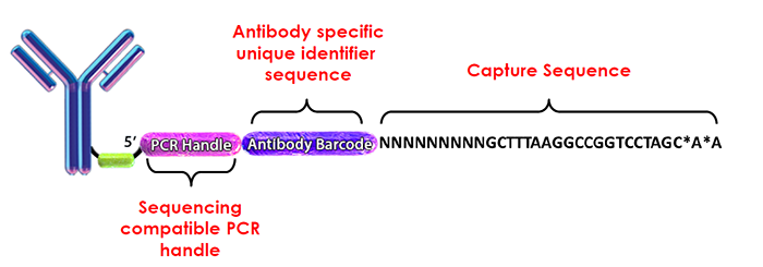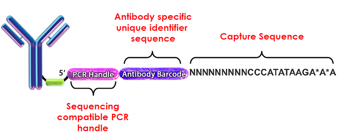 寡核苷酸序列由以下幾部分組成,PCR引物,特異性標(biāo)簽序列(即特異性Barcode)以及Capture序列。Totalseq?-A、BC如下: