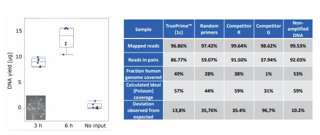 TruePrime?采用MDA技術(shù),基于新型的TthPrimPol 引物酶和Phi29 DNA聚合酶,擴增過程無需添加隨機引物,減少了擴增偏倚,提高了擴增過程的覆蓋率和保真性,并且對于污染的外源DNA不敏感,可重復(fù)性好。TruePrime?可用于單個細(xì)胞或少量細(xì)胞的全基因組擴增,與常見的NGS平臺如Illumina和IonTorrent等兼容性良好。