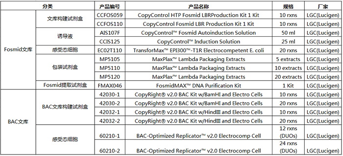 LGC(Lucigen)提供Fosmid文庫(kù)構(gòu)建試劑盒,該試劑盒中的Fosmid載體是行業(yè)金標(biāo)準(zhǔn)(原屬于Epicentre產(chǎn)品),可完成各種生物樣本編制完整和無(wú)偏向的Fosmid文庫(kù),利用自動(dòng)誘導(dǎo)液保證單拷貝和誘導(dǎo)高拷貝數(shù)量的需要。
