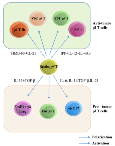 以人的γδT細(xì)胞為例,用不同的細(xì)胞因子以及磷酸化的抗原刺激后,靜息的γδT細(xì)胞可以極化為FoxP3+γδTreg、γδT17、γδTfhγδT1,或成為活化的Vδ1T、Vδ2T細(xì)胞亞群。