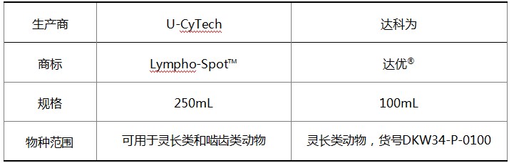 目前,我們同時提供U-CyTech原產(chǎn)的Lympho-Spot?無血清培養(yǎng)基和U-CyTech授權(quán)達科為在國內(nèi)生產(chǎn)的達優(yōu)?無血清培養(yǎng)基。它們的原料來源與質(zhì)控標(biāo)準(zhǔn)完全相同,能獲得同樣出色的檢測結(jié)果。由于物種的差異,部分添加成分在靈長類和嚙齒類之間有差別。U-CyTech公司采取了同時添加的策略,所以生產(chǎn)出的是通用達優(yōu)?無血清培養(yǎng)基;達科為公司采取的是分別添加的策略,所以生產(chǎn)出的是專用達優(yōu)?無血清培養(yǎng)基,分靈長類和嚙齒類兩個品種。詳細(xì)的差別見下表。