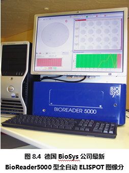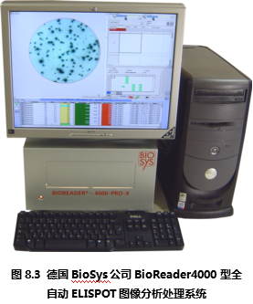 德國(guó)Bio-Sys公司從上世紀(jì)80年代開(kāi)始就致力于生物圖像識(shí)別領(lǐng)域,在進(jìn)入ELISPOT圖像分析儀市場(chǎng)后一直以其先進(jìn)的ELISPOT斑點(diǎn)識(shí)別技術(shù)聞名。德國(guó)Bio-Sys公司首先解決了顯微攝像系統(tǒng)難以定位96孔板上的每一個(gè)孔的問(wèn)題。其解決方法基于圖像識(shí)別技術(shù),利用板孔邊壁和真正的孔底的細(xì)微差別,在機(jī)械定位的基礎(chǔ)上,通過(guò)軟件識(shí)別來(lái)進(jìn)一步提高每孔的定位精度。是目前市場(chǎng)上所有ELISPOT圖像分析儀中唯一能夠完整識(shí)別整個(gè)孔底ELISPOT斑點(diǎn)圖像的設(shè)備。在對(duì)真假斑點(diǎn)的分辨中,德國(guó)Bio-Sys公司除了具備完善的物理學(xué)多參數(shù)識(shí)別技術(shù),還特別針對(duì)ELISPOT斑點(diǎn)形成的生物學(xué)過(guò)程,通過(guò)細(xì)胞因子顯色后的“光密度”峰值積分分析方法,精確分辨真假斑點(diǎn)、融合斑點(diǎn)等復(fù)雜情況。Bioreader系列ELISPOT圖像分析儀國(guó)外大多數(shù)較有經(jīng)驗(yàn)的ELISPOT實(shí)驗(yàn)室推崇的特點(diǎn)為:專(zhuān)業(yè)性和參數(shù)全開(kāi)放性。因?yàn)镋LISPOT實(shí)驗(yàn)的復(fù)雜性,ELISPOT斑點(diǎn)形成在不同的實(shí)驗(yàn)條件下有非常大的差異。這就對(duì)ELISPOT圖像分析儀提出了較高的要求:既要能夠保證斑點(diǎn)計(jì)數(shù)的真實(shí)性和一致性,又要能夠根據(jù)不同情況,通過(guò)實(shí)驗(yàn)者的判斷來(lái)校正儀器對(duì)ELISPOT斑點(diǎn)識(shí)別的標(biāo)準(zhǔn)。要同時(shí)實(shí)現(xiàn)以上兩個(gè)要求,唯一的辦法是將儀器的所有判斷標(biāo)準(zhǔn)向ELISPOT實(shí)驗(yàn)者開(kāi)放,實(shí)現(xiàn)實(shí)驗(yàn)者和儀器的互動(dòng)。在這一方面,德國(guó)Bio-Sys公司始終走在ELISPOT斑點(diǎn)識(shí)別領(lǐng)域的前列,新的Bioreader-4000型(圖8.3)和Bioreader -5000(圖8.4) 型在專(zhuān)業(yè)性和適用性方面都領(lǐng)先于其他廠(chǎng)家的設(shè)備。