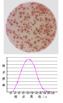 如果一次實(shí)驗(yàn)中有兩類細(xì)胞同時(shí)受到刺激,比如T細(xì)胞與巨噬細(xì)胞,或者一次實(shí)驗(yàn)中T細(xì)胞受到兩種不同的刺激物刺激,比如蛋白抗原與內(nèi)毒素(大腸桿菌表達(dá)的蛋白很可能含有較高濃度的內(nèi)毒素),那么同一個(gè)孔中就會(huì)出現(xiàn)兩種不同的斑點(diǎn)。這兩種斑點(diǎn)用肉眼很難區(qū)別,但是如果對(duì)它們直徑分布做統(tǒng)計(jì)作圖的話,就會(huì)有別于圖1.3中的單峰分布,而是呈現(xiàn)雙峰分布。