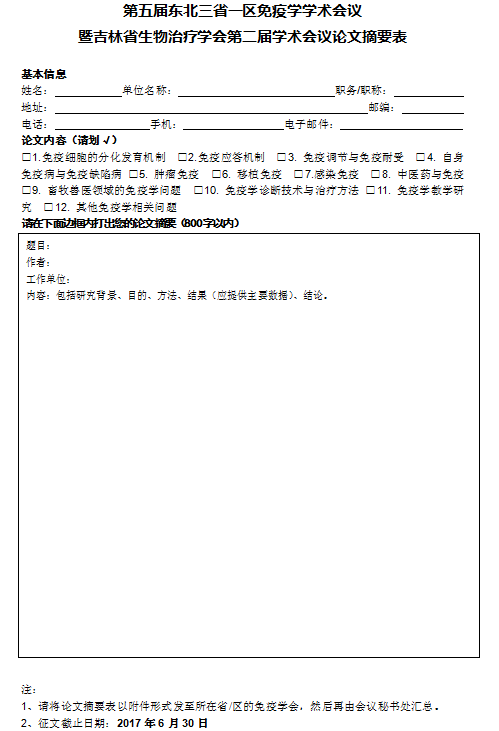 請于2017年6月30日前將“論文摘要表”發(fā)送至所在省/區(qū)的免疫學(xué)會,然后再由會議秘書處匯總。