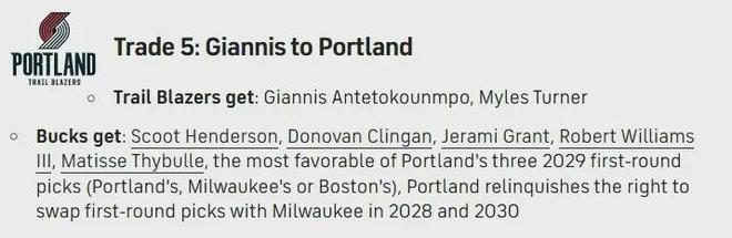 這段時間,開拓者竟然屢次傳出了跟字母哥的“緋聞”。近日知名美媒CBS體育又為開拓者提供了一筆交易方案,即他們得到字母哥+特納,送出亨德森+克林根+格蘭特+羅威+塞布爾+三個29年首輪簽中順位最優的簽位,同時放棄28年以及30年與雄鹿的首輪簽互換權。
